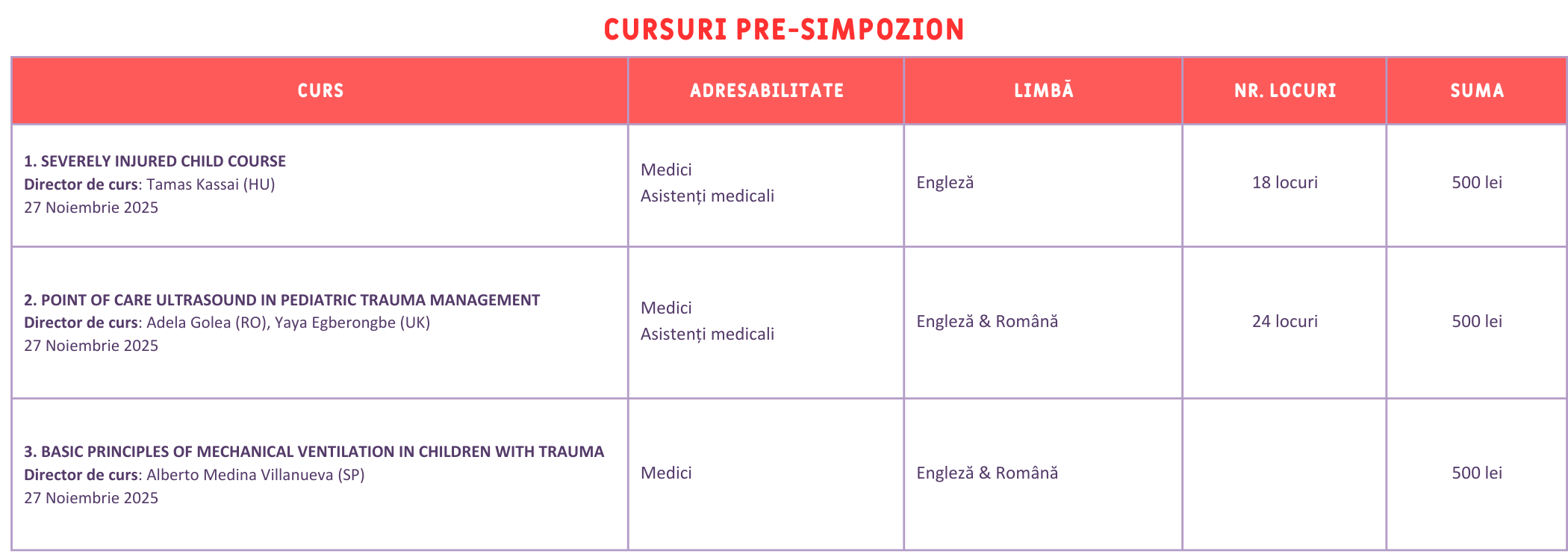 În deschiderea celei de-a V-a ediții a Simpozionului de Medicină de Urgență și Terapie Intensivă Pediatrică, vă invităm să participați la cursurile pre-congres – sesiuni educaționale interactive, susținute de specialiști cu vastă experiență în domeniu.