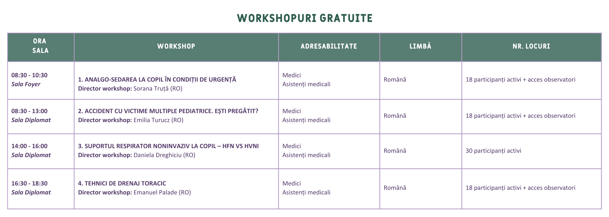 Vă invităm să vă înscrieți la workshopurile gratuite din cadrul celei de-a V-a ediții a Simpozionului de Medicină de Urgență și Terapie Intensivă Pediatrică, organizate în data de 28 noiembrie 2025. Sunt sesiuni practice, gândite pentru a consolida abilitățile esențiale din domeniul urgențelor pediatrice și pentru a facilita lucrul pe scenarii clinice reale, alături de specialiști cu experiență.